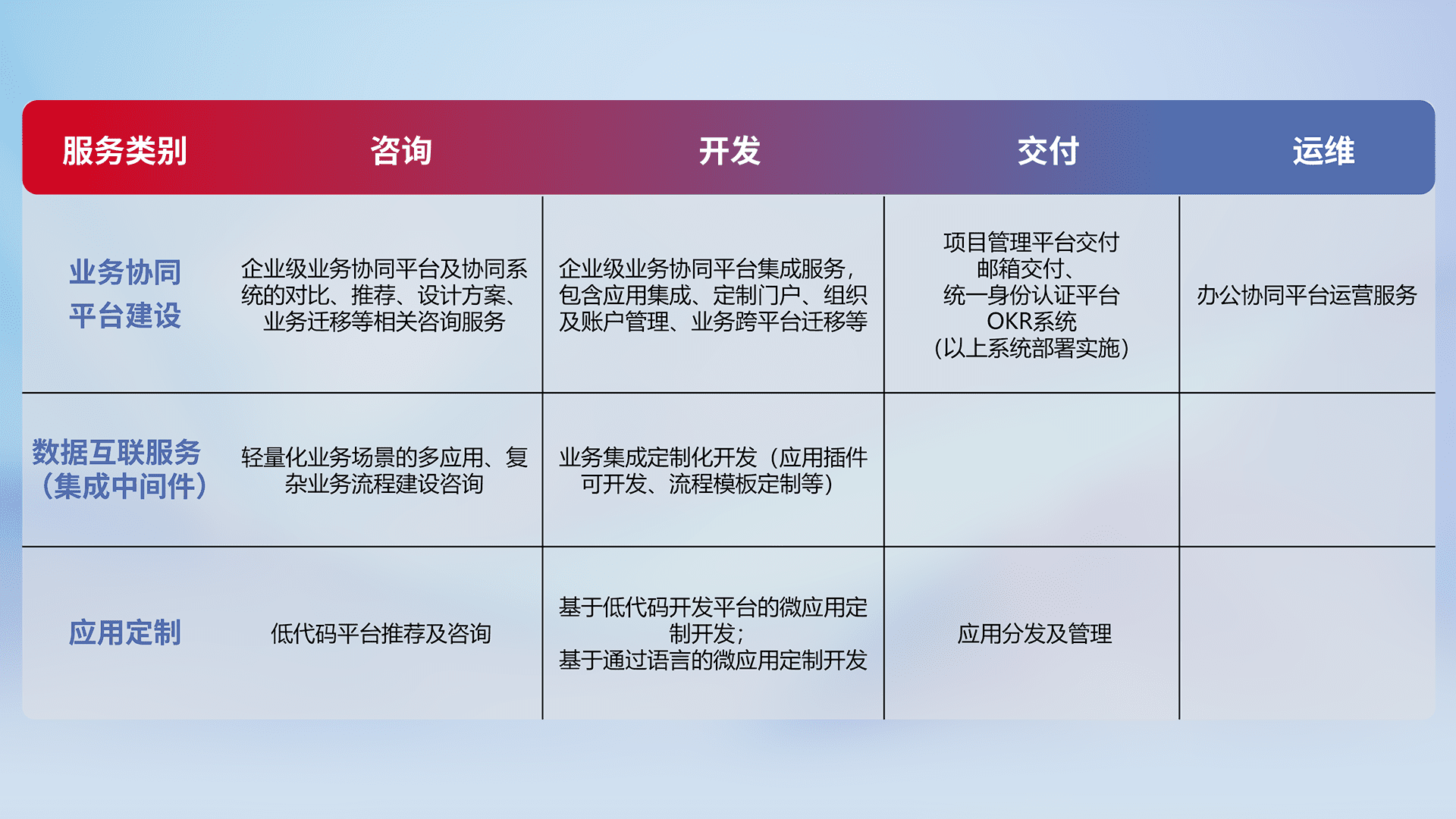 针对钉钉、、、企微、、、、IDaas等平台级产品提供产品的规划、、、、方案、、交付、、、、定制化开发等服务,,实现如统一协同办公、、智能客户服务、、、混合会议管理、、、智能数据查询、、、、等业务场景,,,实现数字化转型。。